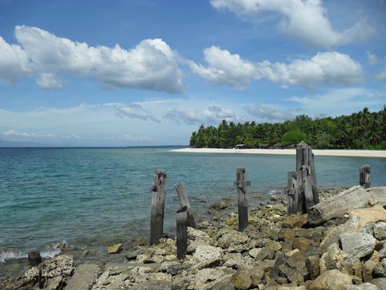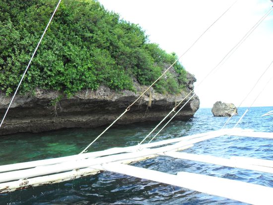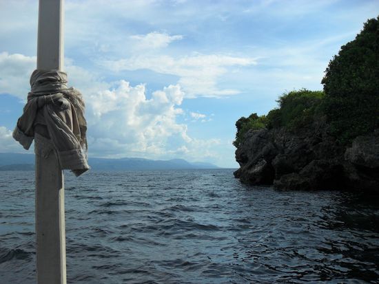 Es ging nach Pescador, einer kleinen Insel etwa 2 km von Moaboal entfernt. Diese Insel gehört, so man einschlägigen Berichten glauben darf, zu den Orten, wo man getaucht sein sollte. An der Oberfläche gibt sie sich nett anzuschauen, aber wehrhaft. Es gibt keinen Strand, nicht mal ein Ufer, sondern nur eine hohe Felskante, die vom Meer bereits angenagt und unterspült wird.