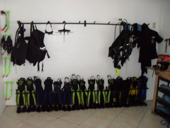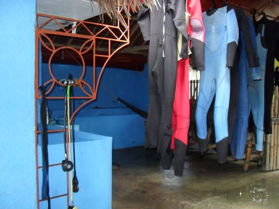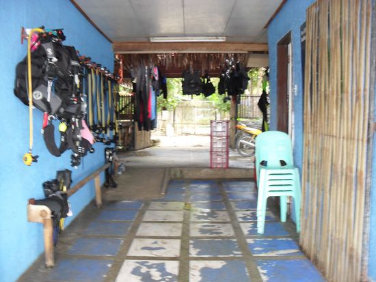 Ich gehe noch etwas weiter und finde etwas versteckt das Cebu Dive Center. Ich gehe rein, es ist zwar klein, einfach und recht dunkel, aber die Einrichtungen für die Ausrüstung ist zweckmäßig und gut aufgebaut. Alles da, besser als bei den deutlich größeren Basen am Alona Beach und auf Mactan. Am Wasser ist sogar noch eine kleine Bar, es wirkt hier gemütlich. Ich frage nach den Angeboten, alles ist in US Dollar angegeben. Diese Umrechnerei... Aber, ein Tauchpaket mit 10 Tauchgängen kostet 180 US$ oder 900 Pesos, das ist günstig. Gut, plus 100 Pesos, aber die kommen bei den anderen Basen auch dazu. Das gefällt mir. Leider hat man im Moment keine Möglichkeiten, mir Tauchgänge anzubieten, man sei voll ausgebucht. Ob ich nicht in 3 Tagen kommen könnte, da sei eine große Gruppe weg. Klar, hier gefällt es mir und es ist günstig, wäre nicht schlau deshalb woanders hinzugehen. Ich habe ein gutes Gefühl bei der Basis.