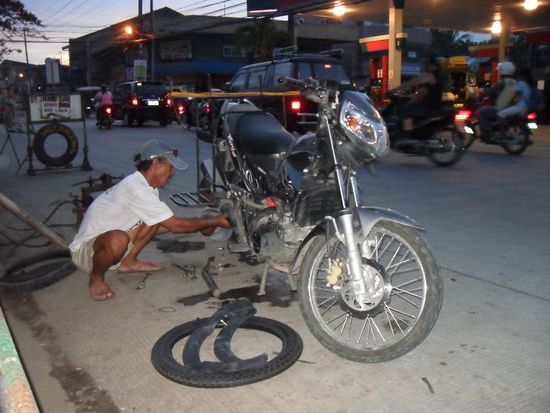 Ich muss nun aber die Reifen noch montieren lassen, das macht hier nämlich nicht der Reifenhändler, sondern die bereits bekannten Vulkanizer. Ich fahre den erst besten an, dort wird auch alles erledigt und alles montiert, was auch ohne Abbau des Heckträgers möglich war. Am Ende kassiert man 70 Pesos, was dann wieder eher der Langnasenpreis war, wenigstens hält sich der Aufschlag in Grenzen.