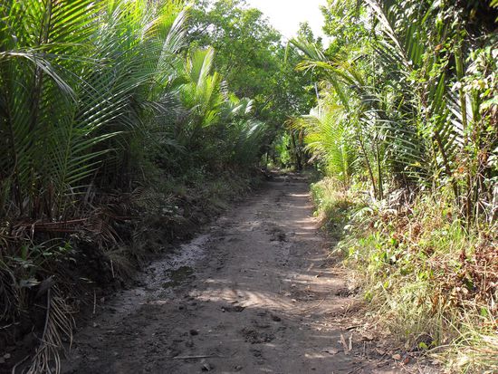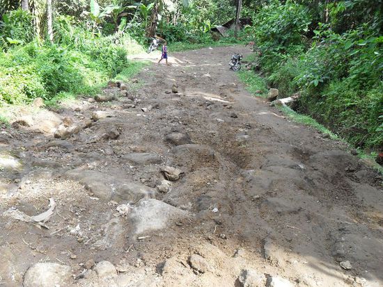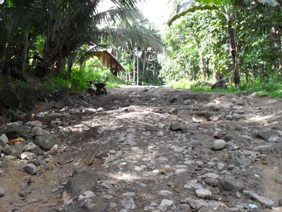 Ich erreiche Malatapay und die Straße zum Pier. Aber nicht nur ich, heute ist hier Markt, Hurra ! Ich kämpfe mich mit meiner vollbeladenen Maschine durch die Massen an Menschen, Tieren und Fahrzeugen, ein wildes Durcheinander. Das schaffe ich dann sogar bis nach vorn zum Anleger, aber wo war hier eine Straße zu dem Resort? Nicht zu finden, auch auf dem Rückweg nicht. Na klasse, einmal umsonst durch die Menschenmassen gekämpft. Ich fahre weiter, aber nur 100 Meter, da steht ein Schild zum Resort, aber von der Hauptstraße abgehend und nicht, wie im Reiseführer beschrieben, von der Straße zum Pier. Der Weg hier ist aber alles andere als besser, gleicht mehr einem Dschungelpfad... zum Glück habe ich die Reifen gewechselt...