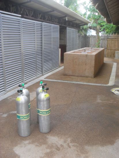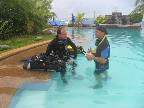 So fahre ich am nächsten Morgen als Praktikant zur Tauchbasis. Nach und nach lerne ich alle dort kennen, Büro, Bootscrew und den hauptamtlichen Guide. Man zeigt mir sämtliche Einrichtungen. Das Wetter heute ist recht rauh, daher kann das Tauchboot heute nicht losfahren. Also losfahren könnte es schon, aber die Taucher hätten ihre helle Freude, das Boot überhaupt zu erreichen, da gute 20 Meter durch doch recht ansehnliche Wellen durch Wasser zu laufen gewesen wäre. Das wollte man ihnen nicht zumuten, daher wurde der Tauchgang abgesagt. Im weiteren Verlauf des Tages schaute ich Raphael bei der Unterrichtung eines neuen Tauchschülers zu, schnupperte hier und da rein. Am Ende des Tages teilte er mir mit, morgen soll ich einfach mit nach Apo Island raus fahren und meine Erfahrungen sammeln. Na das hört sich doch gut an, hoffentlich spielt das Wetter mit.
