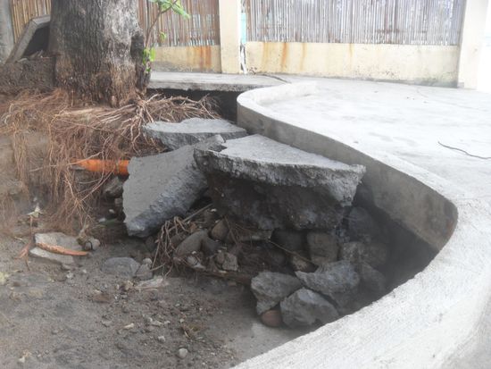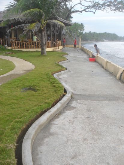 Ich habe also scheinbar etwas Zeit und gehe zum Meer, mal schauen, wie es heute mit den Wellen ausschaut, gestern war ja nix möglich. So laufe ich nach vorne und... was ist denn hier los? Der Weg liegt voller Steine und Pflanzenteilen und dann, wieso hängt die kleine Mauer vor dem Meer so komisch? War der Riss im Weg davor gestern schon? Ich meine nicht. Und was ist da vorne los? Der ganze Weg scheint unterspült, eine Palme ist fast ausgegraben. Mir schwant, hier haben gestern die Wellen ganze Arbeit geleistet und das zurück fließende Wasser hat den Weg und die Mauer unterspült, bis beides nachgab. Das nennt man wohl auf Sand gebaut. Auch im Restaurant wird eifrig der Boden gewischt, hier scheint es ja ordentlich abgegangen zu sein. Auch hat sich das Meer nicht wirklich beruhigt, noch immer ist die Brandung 1-2 Meter hoch.