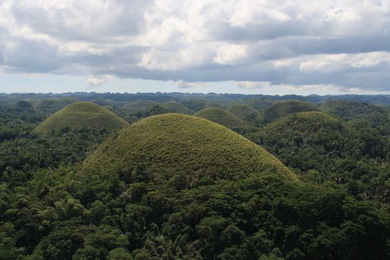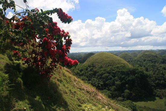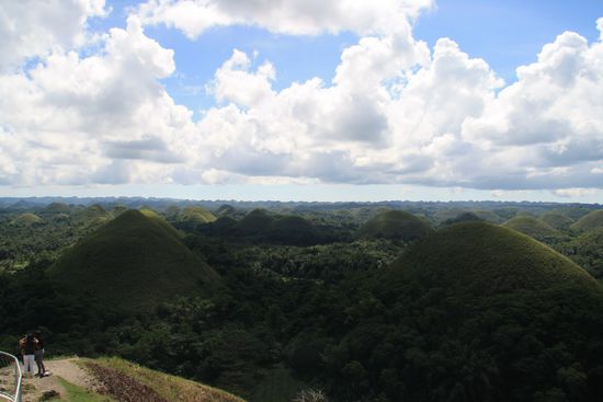 Schließlich erheben sich die ersten Hügel aus der Landschaft. Von der Form sehen diese so aus, wie man als Kind eben Hügel gemalt hat. Den Namen Chocolate Hills haben sie erhalten, weil zur Trockenzeit die Farbe wohl wie Schokolade wirkt. Wir sind aber nicht zur Trockenzeit da, bei uns sind sie satt grün.