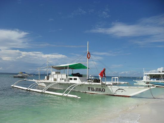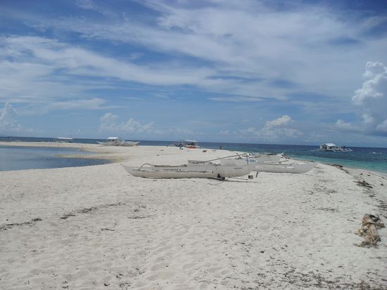 Auf dem Rückweg gibt der Fahrer Gas, bzw er will Gas geben. Die Banka scheint aber nicht mit den Wellen von hinten klarzukommen. Er darf anscheinend weder schneller sein, sonst tauchen die Ausleger in die Welle ein, noch darf er langsamer sein, da sonst Wasser in das Boot schlägt. Zumindest scheint es für mich als Laien so. Er muss praktisch auf der Welle reiten, was ihm nicht immer 100 prozentig gelingt. Bankas sind in meinen Augen ziemlich dämliche Boote, ich kann keinerlei Sinn in diesem Bootstyp erkennen. Ich erinnere mich irgendwo gelesen zu haben, dass Philippinos eher schlechte Seeleute und schlechte Bootsbauer sind. Ich denke, das kann man bestätigen. Es verwundert nur etwas bei einem Land was nur aus Inseln besteht und immerhin waren hier hunderte von Jahren die Spanier Kolonialmacht und die bauten nicht die schlechtesten Schiffe. Egal, wir kamen gut wieder an, ich hatte meinen Spass und Sibille auch.