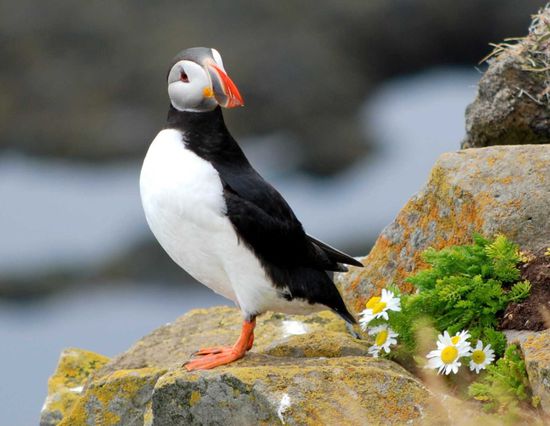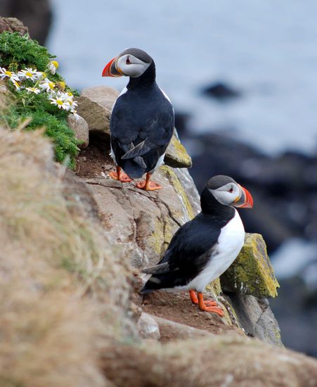 Unglaublich, da sitzen sie! 3,4,5,6, zum Greifen nahe. Manche putzen sich und sehen uns so an als wollten sie sagen: "Na, sind wir nicht schön?" Daß wir hier viele Fotos gemacht haben, ist wohl klar. Als wir uns an den putzigen Kerlchen satt gesehen hatten, waren die anderen Tiere dran. Als erstes sah ich unten im Meer auf einer Klippe 12 Seehunde, Rainer entdeckte dann aber noch viele mehr. Weiter oben im Gelände, in einer Felswand, saß eine riesige Kolonie Trottellummen. Von den Unmengen an Möwen ganz zu schweigen. Leider mußten wir uns irgendwann verabschieden, denn wir wollten heute noch bis Talknafjördur fahren, und bei den Straßen geht es nun mal nicht schnell.