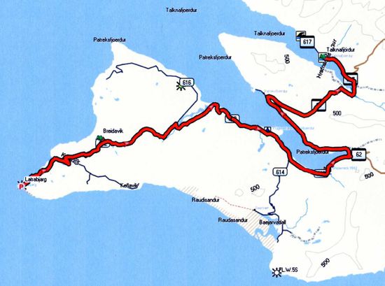 Der Abzweig nach Latrabjarg war wieder eine schlimme Schotterstraße, die sich teilweise ganz eng an die steilen Berge schmiegte. Oft wurde vor Steinschlag gewarnt. Mir war gar nicht wohl dabei!