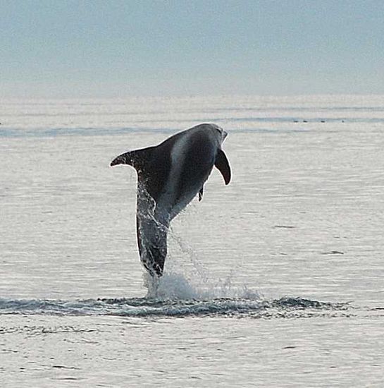 Danach wurde es Zeit aufs Schiff zu gehen. Schon nach kurzer Fahrt sichteten wir den ersten Wal, einen Zwergwal. Es sollte auch der einzige bleiben. Dafür tauchten plötzlich Delphine auf und erfreuten uns. Mal links mal rechts des Schiffes begleiteten sie uns und sprangen auch ein paar Mal hoch aus dem Wasser heraus. Wie viele Tiere es waren, kann man nur schätzen, etwa so 15 bis 20 Stück. Es war ein tolles Erlebnis und wunderschön anzusehen.