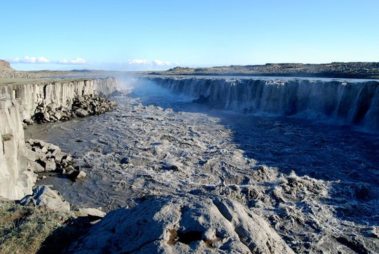 Ein spannender Moment. Wie kommen wir von unserem Stellplatz runter? Trotz einer neuen Strategie schafften wir es erst beim zweiten Anlauf und dann auch nur wieder mit einer verbogenen Stütze, diesmal aber auf der anderen Seite. Das Wetter war herrlich und mit über 20 Grad überdurchschnittlich warm für Island. Die Strecke von Myvatn nach Grimsstadir war nur sehr kurz. Hier stellten wir uns auf einen kleinen, privat geführten Platz und faulenzten in der Sonne. Am Nachmittag fuhren wir dann in einer Staubwolke hinter anderen Touristen zum Dettifoss. Er besteht eigentlich aus fünf hintereinander liegenden Wasserfällen. Nachdem wir eine Weile am Dettifoss gesessen hatten, sind wir am Fluß entlang noch zum Sellfoss gegangen. Er hat eine große Hufeisenform, und wir fanden ihn noch schöner.