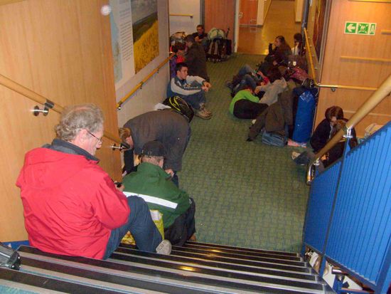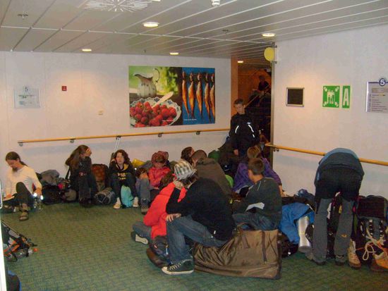 Die "Check-in-Zeit" in Hanstholm war nicht 1,5 sondern 2 Stunden vor Abfahrt der Fähre. Wir waren erst spät in der Nacht dort angekommen und hatten uns eigentlich vorgestellt, daß wir in Ruhe dort frühstücken und dann an Bord fahren könnten. Dummerweise standen wir dicht am Zaun des Hafengebietes, so wurde morgens um 7 Uhr lautstark an den Wohnwagen geklopft und wir wurden aufgefordert, umgehend zur Abfertigung einzufahren. Um 9 Uhr wurden dann alle Passagiere ins Empfangsgebäude gescheucht und dort mindestens eine Stunde eingepfercht. Darunter waren viele Mütter mit zum Teil kleinen Kindern. Geht man davon aus, daß die Fähre im Sommer mit 1500 Passagieren ausgebucht ist, mußten das dann wohl ungefähr 1000 Personen gewesen sein. Möglicherweise gab es irgendwo im Gebäude wohl auch einen Fahrstuhl und Gepäckwagen, aber sicherlich nicht ausreichend für so viele Menschen. Die wartenden Passagiere erhielten keine Informationen, und Sitzplätze gab es auch nicht ausreichend.