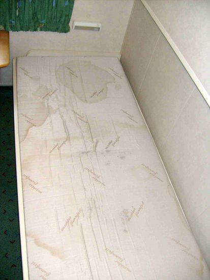 Wir sehen als Ursache für die negativen Eindrücke die kurzen Hafenliegezeiten, das Personal ist einfach nicht ausreichend und überfordert. Das Schiff ist ja praktisch ständig in Fahrt, in so kurzer Zeit kann keine vernünftige Reinigung und Wartung durchgeführt werden. Offensichtlich geht es der Reederei nur um Profit. Auf welchen Matratzen wir schlafen mußten, zeigte sich, als wir vor der Ankunft in Seydisfjördur zwei Stunden auf dem Flur warten mußten. Bilder der dreckigen und schimmligen Matratze fügen wir bei. Eigentlich wäre dies ein Fall für die Gesundheitsbehörden.