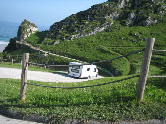 Ich habe einen Platz in der Nähe von Llanes ausgesucht, den "Camping La Paz" bei Vidiago. Das Zufahrtssträßchen dorthin ist schmal und gleich an der Rezeption geht es sehr steil den Berg hoch. Auweia, was habe ich denn da ausgesucht. Der Platz liegt wunderschön auf einer Klippe über dem Meer - die Zufahrt ist aber leider von unten. Aber schon kommt ein CP-Mitarbeiter herbeigeeilt und erklärt uns, dass wir am Parkplatz abkuppeln sollen, weil die Wohnwagen mit dem Landrover zum Platz hochgezogen werden.