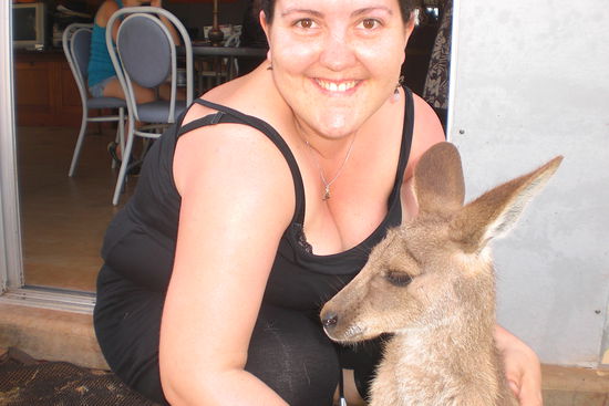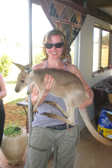 Da kommt uns auch schon etwas entgegengehopst... Es hat braunes Fell, braune Augen und ganz lange Wimpern. Der erste Blick in diese Augen jagt ein Gefühl durch meine Adern, dass ich nicht beschreiben kann. Mein erstes Känguru. Nicht in einem Zoo, nicht mit 100 anderen Leuten um uns herum, die alle Fotos machen. Nein, ein Känguru (fast) da wo es hingehört! Es ist einer der Momente, die man nicht vergisst. Alles fühlt sich an wie im Film: Hallo Anett, du bist in Australien! Hast du es jetzt kapiert!? Alles ist so irreal und trifft genau meine Vorstellungen. Ich könnte auf der Stelle anfangen zu heulen. Mein Gott und wie niedlich das Känguru ist!!! Es ist 7 Monate alt (leider hab ich seinen Namen vergessen) und absolut zutraulich. Wir können es kraulen, streicheln und es fasst unsere Hände und schaut uns dann einfach an.