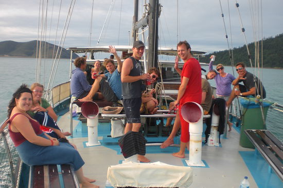 Die Witsundays rufen! Um 13.30 Uhr holt uns die Boots- Crew an einem Treffpunkt am Hafen in Airlie Beach ab und wir dürfen erstmal gleich 15 Doller für die Stingersuits abdrücken. Das passt keinem, da wir dachten die seien schon inklusive gewesen. Hätte man auch erwarten können bei nem Tourpreis von knapp 300 Dollar. Aber nützt nix, man muss sie zahlen. Es ist nämlich immer noch Quallensaison und der Stingersuit schützt im Wasser vor den gefährlichen Biestern. Ihr müsst euch das vorstellen wir nen Ganzkörperanzug aus Badeanzugstoff. Sehr sexy also