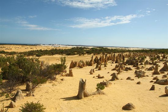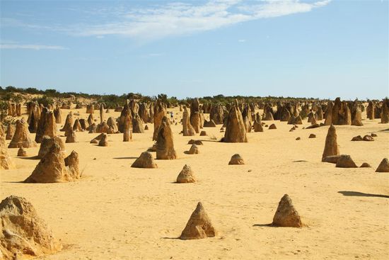 Und dann war er endlich da, der Tag, wo unsere Westküstentour begann. Auf diese hatte ich mich von ganz Australien am meisten gefreut. Es war ein frühes Aufstehen, denn wir mussten nach Perth um uns der Tour anzuschliessen, dort trafen wir dann unsere Gruppe. Zuerst war ich ein bisschen genervt, weil nicht mehr zwei Sitze nebeneinander frei waren und ich daher nicht neben Adi sitzen konnte. Das hat sich aber schnell geändert als ich gemerkt habe, wie nett meine "Sitznachbarin" Doris ist. Oder besser gesagt Weng Si (oder irgendwie so), ein Mädel aus Hong Kong, dass von ihrer Lehrerin einen englischen Namen erhalten hat, den sie im Ausland braucht. Und der Zopf, den wir am Tag vorher gebacken hatten, hat natürlich auch zu meiner guten Laune beigetragen. Am ersten Tag hatten wir eine lange Fahrzeit. Einmal konnten wir aussteigen um uns die Pinnacles anzusehen. Der Platz sieht aus, als hätte ein Riese rasch überall ein paar grössere Steinstücke verteilt, so wie es ihm halt grad beliebte. Es war ein schöner kurzer Gang durch die Pinnacles, auch wenn ich mir die etwas grösser vorgestellt hatte.
