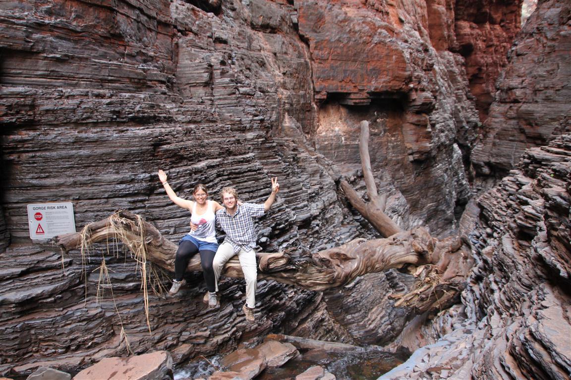 Die halbe Nacht durch regnete es aber glücklicherweise war es am nächsten Morgen wieder etwas schöner und es ging auf zu unserem ersten Walk . Gleich am Anfang ging es zu einem kleinen Wasserfall, wo ich meine Haare unters Wasser gestreckt habe um mich zu waschen. Es war einfach ein super gutes Gefühl. Karijini ist ein wunderschöner Platz und definitiv ein Grund noch ein fünftes Mal nach Australien zu kommen. Die Farben waren, wenn sich die Sonne zwischendurch zeigte, total schön. Ausserdem ist das Wandern alles andere als langweilig weil es WIRKLICH über Stock und Stein geht. Unten an der Gorge angelangt, meinte unser Guide, dass wir noch ein bisschen weiter mit ihm gehen können, wenn wir ein bisschen eine Herausforderung wollen, es sei aber mehr Klettern als Wandern und es fällt immer wieder mal einer runter ins Wasser. Adi und ich beschlossen die Herausforderung anzunehmen und los gings. Ich bereute es schon ziemlich schnell, weil ich schon beim ersten Stück meine Probleme hatte. Ich verlor meine Sonnenbrille und sie fiel ins Wasser. Ich liess sie einfach dort, weil ich einfach nur noch wieder auf sicherem Boden stehen wollten. Endlich erreichte ich das erste Zwischenstück. Zum Glück konnte einer der Jungs meine Sonnenbrille rausfischen. Der Guide meinte das nun ein einfaches Stück komme und dann ein sehr schwieriges, wo die Leute anfangen ins Wasser zu fallen. Ich beschloss daraufhin nach diesem ersten Stück das dritte Stück auszulassen. Ein gute Entscheidung: Adi gewann die Wette gegen eine Deutsche dass jemand reinfallen würde. Kaum hatten sie gewettet, hörte man schon ein Platschen und das Gejohle der anderen. Weil ich nicht richtig Lust hatte wieder zurückzuklettern und weil das Wasser einfach super klar und schön war beschloss ich zurückzuschwimmen und Adi hat meine Kleider und Schuhe mit sich zurück genommen. Das Wasser war kalt. Richtig kalt. So kalt, dass ich richtig meinen Körper gespürt habe, wie er sich wieder aufgewärmt hat. Aber es hat sich gelohnt. Die Sicht vom Wasser aus war superschön und es war soooo erfrischend. Und es war lustig an all jenen vorbeizuschwimmen, die das gleiche Stück mühsam geklettert waren