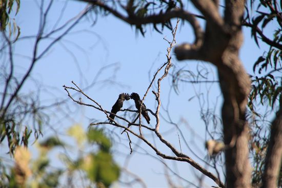 Auf dem Weg hoch hat sich Adi meine Kamera geschnappt, weil er noch ein paar Fotos machen mussten (wenn jemand zu viel Geld hat, Adi braucht dringend eine eigene Spiegelreflexkamera ). Oben angekommen hat mich jemand auf zwei Vögel hingewiesen, die sogenannten Red-tailded black Cocaktoo, die sehr selten sind. Ich habe mich natürlich gleich wieder geärgert, dass ich meine Kamera aus den Händen gegeben habe und als Adi nach einer Minute immer noch nicht aufgetaucht ist, bin ich wieder ein paar Stufen nach unten gegangen und habe nach Adi gerufen, der kam dann selber aber nicht um hochzukommen sondern seinerseits mich runterzurufen. Und um ehrlich zu sein: Er gewinnt den "wer-sieht-etwas-besseres-Wettbewerb". Aber seht selber: