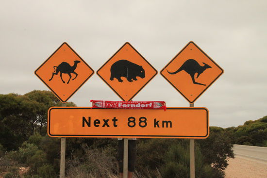 wir haben es geschafft: wir haben die Nullarbor Plain überstanden! "Überstanden" ist wirklich das richtige Wort. Außer alle 200km ne Tankstelle gibt es hier NICHTS. Nicht mal die Landschaft ist irgendwie interessant - es gibt ja net mal Bäume hier (Nullarbor heißt soviel wie "keine Bäume"). Und dann geht die Straße echt Kilometerweit einfach nur geradeaus. Das macht Fahrer und Beifahrer echt mürbe, das kann man sich nicht vorstellen. Die längste Strecke die einfach nur gerade durch das NICHTS führt, ist 146 km lang - es kommt wirklich nicht mal ne kleine Kurve, nichts, einfach nur geradeaus. Unglaublich.