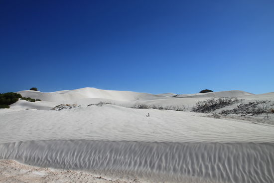 Auf der Strecke war kilometerweit einfach nichts (außer Straße und niedergebranntes Gestrüpp oder Weideland). Zwischendrin dann aber wie aus dem Nichts riesig weite Sanddünen aus strahlend weißem Sand - perfektes Motiv!