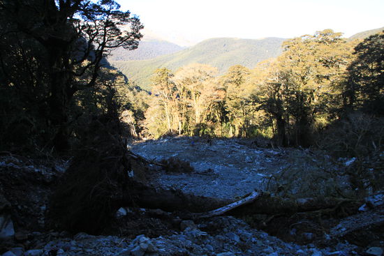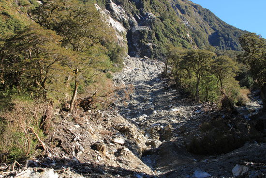 Bereits nach kurzer Zeit ging es bergauf über Geröllfelder wo vor noch nicht allzulanger Zeit ganz schön viel Gestein vom Berg runterkam - und damit auch Bäume (in Deutschland wäre das Feld bestimmt nicht zur "öffentlichen Überquerung" freigegeben worden).