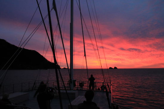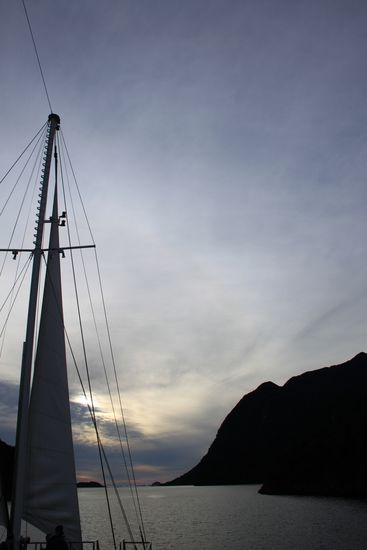 Zurück im Fjord genossen wir den unglaublichen Sonnenuntergang. Wenn sogar Crewmitglieder mit der Spiegelreflexkamera an Deck rennen und wie wild knipsen, dann kann das nur heißen, dass wir mit diesem Sonnenuntergang wirklich sehr großes Glück hatten.