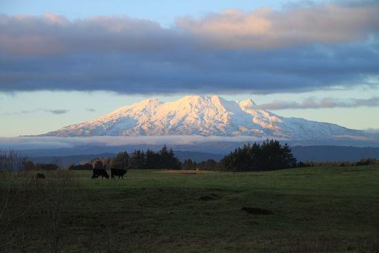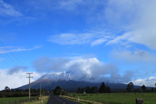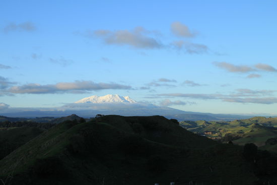 Und auf einmal schrie Meik "sofort anhalten", wir waren mitten in einer Kurve und Melli ist so erschrocken, dass sie eine Vollbremsung hinlegte und wir mitten in der Kurve standen. Meik "erlaubte" dann aber doch, dass wir noch 5 Meter weiter in eine Parkbucht fuhren. Und dann sah auch Melli endlich, was der Grund für Meiks Geschrei war. Wie aus dem Nichts ragte der weiße Kegel des Mount Ruapehu - einer der 3 Vulkane im angrenzenden Nationalpark - hervor. Das war unglaublich, vor uns die saftig grünen Hügel mit Schafen und dann mittendrin dieser krasse, weiße Berg... okay, wir spannen euch nicht länger auf die Folter: