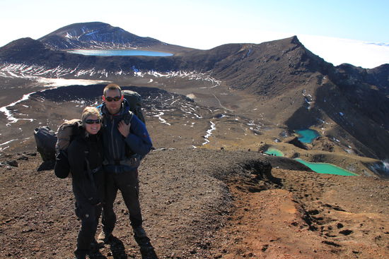 So machten wir es: wir haben eine 2-tägige Wandertour durch den Tongariro Nationalpark gemacht. Der NP ist bekannt für seine 3 Vulkane - von denen wir bereits bei unserer Fahrt von Wanganui den Gipfel des Mt. Ruapehu sehen konnten (ihr erinnert Euch: "Sofort anhalten"!).