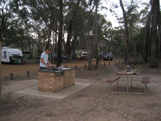 Im Stirling Range NP angekommen haben wir gleich unsere Nachtstation angefahren. Hier kann man für 7 AUD / Person (ca. 5EUR) ganz legal mit Zelt oder Van übernachten, hat Toiletten und sogar ne BBQ-Stelle mit Gasplatten.