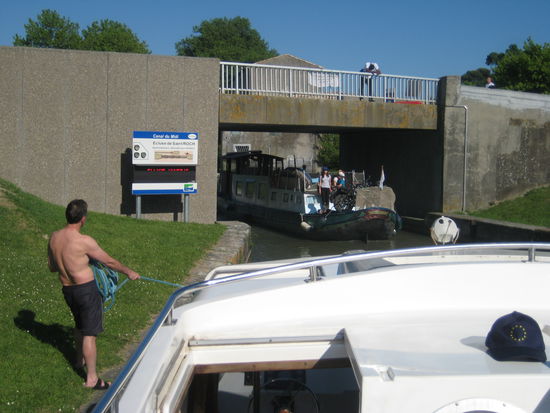 Gleich hinter dem Hafenbecken liegt die Viererschleuse "Roc", wo die Ampel Rot zeigt und 30 Minuten Wartezeit elektronisch angezeigt werden. Nur zwei Schiffe passen ins Schleusenbecken - aber wir haben die "Pole Position" vor der Schleuse ergattert.