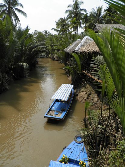 Die Fahrt ca. 6 Stunden im Bus war eine Flut von Eindruecken. Auch die Faehrfahrt ueber den Mekong war interessant. Viele Haeuser sind auf Meterhohe Stelzen gebaut, z.T. sicher mehr als 4 Meter. Cool war ein eigentlich gut eingerichteter Friseursalon, den man nur uber eine 2 Meter hohe Huehnerleiter erreichen konnte.