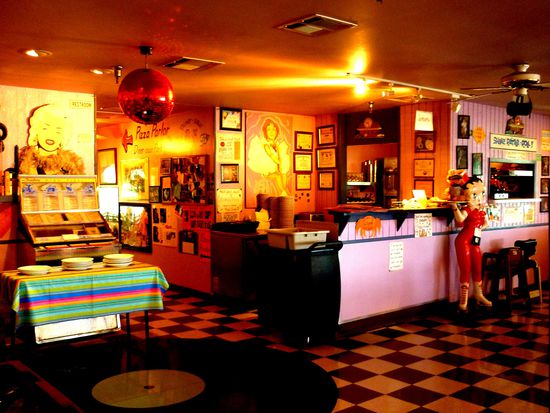Früh ging es auch heute los, nämlich um 06:00 Uhr, um die Strecke möglichst stressfrei zu bewältigen. Die Fahrt ist anfangs stink langweilig, weil es nicht wirklich viel zu sehen gibt auf dem Weg. Im Auto sitzen und Lesen war auch noch nie mein Fall, aber diesmal ist es so und es ist ganz entspannend. Irgendwann fahren wir bei Barstow am Ghost Town Exit raus und finden uns auf einem Parkplatz wieder mit echtem 50er Jahre Diner. Schwesterherz und Schwagerlein waren da schon letztes Jahr mal und total begeistert. Und es ist einfach sehenswert: http://www.peggysuesdiner.com/ . Man kann hier essen und wird von Mädels in original "Tracht" mit Pettycoat und Kopfhäubchen bedient und man kann 50er Jahre Sachen kaufen. Ein Himmel, man kann es nicht anders sagen. Ettliche Blechschilder und Brotdosen von Lucy später, können wir dann endlich weiter fahren.
