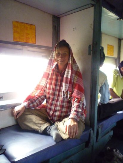 Im Bus nach Jabalpur. Angelica bekommt eine gemütliche Koje zugeteilt. Hat aber den Nachteil, dass sie nicht viel von der Landschaft sehen kann.