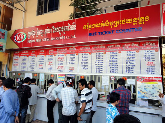 Unterwegs ist mir meine kleine Sony endgültig kaputt gegangen. Seit zwei Jahren schon hat sie immer öfter Bildfehler produziert, als ob Schmutzflecken auf der Linse wären, aber die habe ich schon zig Mal gereinigt. Es scheint eher etwas mit dem Speicherchip zu sein. Und jetzt geht die Akkuklappe nicht mehr zu. Also muss ich dringend als erstes in Phnom Penh einen neuen Foto kaufen. Zumindest eine kleine kompakte. Von Kampong Cham aus haben wir noch einmal etwa 2,5 Stunden gebraucht bis Phnom Penh. Mein Sitznachbar ist Lehrer in Kratie und besucht seine Tochter die in Phnom Penh lebt. Er erzählt mir, dass er zwei Jobs hat und zwei Häuser, eines in Kratie und eines in Phnom Penh. Nachdem ich aber sein Englisch kaum verstehe kommt kein richtiges Gespräch zustande. Immerhin sagt er mir, dass er auch an dem Busbahnhof beim Zentralmarkt aussteigen will, wo ich auch raus muss. So wie es aussieht ist der Busbahnhof aus meinem Stadtplan im Know-How kein allgemeiner, sondern der von der Soraya Phnom Penh Bus Company. Zumindest habe ich nur Busse von denen gesehen und auch am Kartenschalter steht der Name. Immerhin ist es wohl eine der größten und wichtigsten Busgesellschaften in Kambodscha.