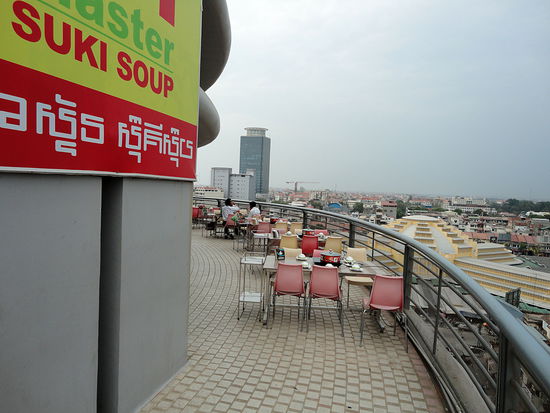 Um überhaupt ein paar Bilder von Phnom Penh zu haben bin ich gleich noch einmal zum Soraya Shopping Center gelaufen um von oben ein paar Fotos zu machen, bevor es zu dunkel wird. Während ich auf das Gebäude zulaufe und hoch schaue sehe ich, dass über der Terrasse von gestern in dem Runden Anbau in dem sich die Restaurants befinden noch eine Terasse befindet. Da muss ich hoch. Bei der ersten Terrasse angekommen sehe ich, dass es in dem Suppenrestaurant dort tatsächlich eine Treppe gibt. Zwar ist es zum Essen für mich noch zu früh, aber ich laufe einfach durch und die Treppe hoch. Oben geht es auf die Terrasse, die auch zum Restaurant gehört. Das ziemlich große Restaurant ist jetzt schon recht gut besucht, aber diese typischen Fonduerestaurants finde ich für eine Person immer etwas unpassend. So etwas macht in einer größeren Runde einfach mehr Spaß. Also schieße ich ein paar Fotos, was mir erfreulicherweise nicht verboten wird. Das habe ich schon anders erlebt. Und bin wieder gegangen. Wenn ich das richtig sehe ist das wohl der mit Abstand beste Aussichtspunkt für Phnom Penh bis jetzt.