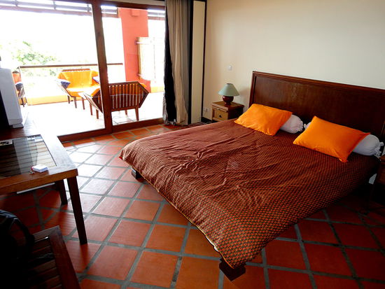 Mein Hotel Le Reserve klingt nicht nur französisch, sondern es ist wohl tatsächlich ein französisches Hotel mit französischem Eigentümer oder zumindest Manager und französischem Restaurant. Das Zimmer ist toll, nur an den Terrakotta Boden mit den breiten Fugen muss ich mich erst gewöhnen. So etwas finde ich als Hotelfußboden nicht so wirklich passend. Dafür gibt es einen tollen Balkon vor jedem Zimmer mit Blick auf den riesigen Pool und auf das Meer.