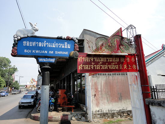 Ich laufe über die Brücke zurück und die Straße in brütender Mittagshitze Richtung Hotel. Nach ein paar Minuten komme ich an Motorradtaxifahrern vorbei und frage nach dem City Shrine. Die zeigen nur gerade aus und ich laufe weiter. Gut dass ich nichts gesagt habe von wegen fahren. Keine 50 Meter weiter stehe ich vor dem Tempel der von der Stadtbücherei verdeckt war. Hier trinke ich in dem kleinen Straßenkaffee erst einmal einen Eiskaffee bevor ich mir als letztes für heute den Stadtschrein anschaue. Auch der ist wieder chinesisch geprägt. Hier scheint es so etwa wie heiliges Wasser oder so zu geben das aus einer Art überdimensionalen Vase fließt. Mit dem überschütten sich immer wieder einmal Thais.