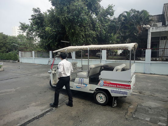 Das City Hotel hat den einzigen TukTuk den ich bisher hier in Rayong gesehen habe und zwar im Stil der kambodschanischen aber als "Stretchversion" mit einer Zusätzlichen Sitzbank und ganz in weiß. Man könnte es im ersten Moment auch für einen Golfwagen halten. Mit dem bin ich kostenlos zum Busbahnhof gefahren worden. Der befindet sich noch ein ganzes Stück östlich vom Tesco. Nachdem es heftig geregnet hat, hat der Fahrer erst einmal die Sitzbänke trocknen müssen. Übrigens scheint man den wohl auch als Transportmittel zur Driving Range nutzen zu können. Das kostet dann 50 B.