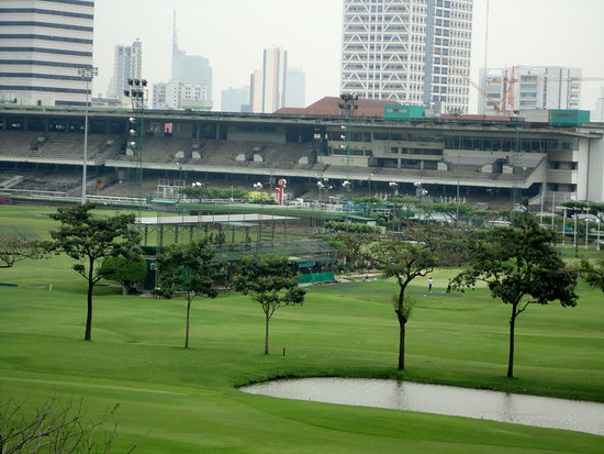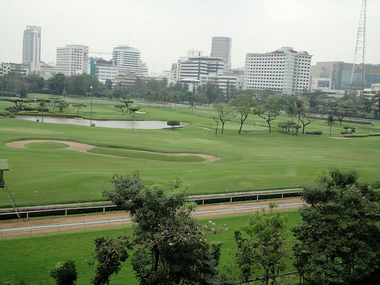 Die Haltstelle liegt am Rand des Royal Bangkok Sports Club. Bei meinem Aufenthalt vor 5 Wochen habe ich gesehen, dass sie hier inzwischen auf dem Gelände mitten in der Stadt einen Golfplatz eingerichtet haben. Das wollte ich mir einmal näher anschauen. Leider befindet sich der Eingang wohl auf der gegenüberliegenden Seite. Ziemlich in der Mitte des Geländes gibt es auch eine Driving Range. Beim nächsten mal muss ich versuchen wie weit es von Siam aus zu laufen ist.
