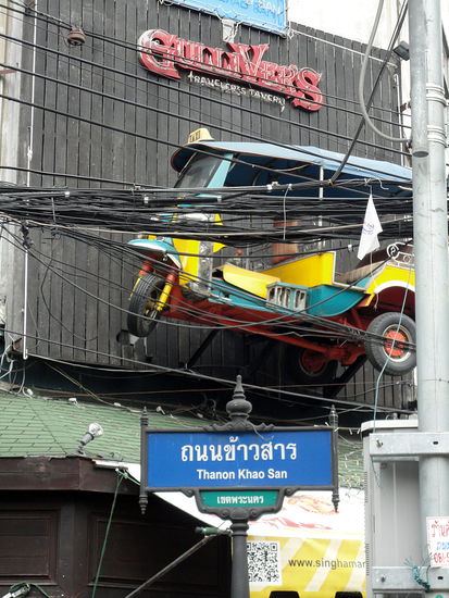 Gegenüber vom Tempeleingang, etwas versetzt beginnt die Khaosan Road. Auch die ist für den Verkehr weitestgehend gesperrt und zur Fußgängerzone umfunktioniert. Eins muss man lassen. Die beiden Straßen bzw Wege sind mit Sicherheit die ruhigste und gemütlichste Möglichkeit, essen und trinken zu gehen. Nur - es hat halt nicht wirklich viel mit Bangkok zu tun. Es erstaunt mich immer wieder, wie die Travellergemeinde es schafft, aus einem Gebiet etwas völlig anderes zu machen. Vang Viang in Laos ist da ja auch so ein Musterbeispiel aus neuerer Zeit. Goa und Kathmandu dagegen Beispiele dafür, dass das schon seit Jahrzehnten zu funktionieren scheint.