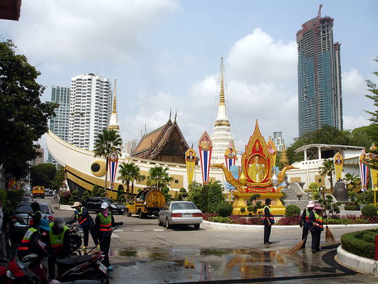 Damit habe ich meine Erkundungen abgebrochen und bin mit Metro und Hochbahn Richtung Taksin. Dort angekommen habe ich endlich einmal den ziemlich großen, interessant aussehenden Tempel angeschaut, auf den man von hier herunterschaut. Überrascht stellte ich fest, dass es sich um den Yannawah Tempel handelt. Im Wat Phra Kaeo hängen Fahnen auf denen die neuen wichtigsten, heiligste Tempel in Bangkok aufgeführt sind. Dazu gehört auch eben dieser Yannawah Tempel.