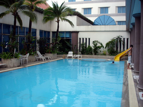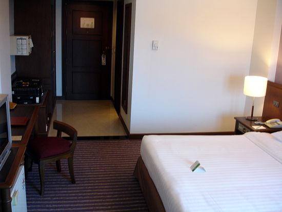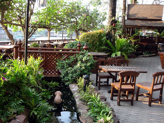Der Boy bringt mich auf mein Zimmer im 6. Stock, sieht das es zwei Einzelbetten hat und fragt ohne dass ich etwas sagen muss, ob er nach einem andern Zimmer mit großem Bett fragen soll. Problemlos bekomme ich ein anderes Zimmer mit einem großen Bett und neue Gutscheine für Wellcomedrink und Frühstück. Den Drink bekomme ich ab18:00 im italienischen Restaurant des Hotels. Außerdem gibt es einen Chinesen, einen "Coffeeshop" und ein Terassenresturant direkt am Fluß, das Suri Ram (oder so ähnlich ). Vor alles das Suri Ram wirkt unglaublich gemütlich. Hier muss ich heute Abend auf jeden Fall noch was trinken. Im dritten Stock gibt es dann noch einen schönen nur leider recht flachen Pool. An der tiefsten Stelle ist er gerade mal 1,50 tief. Aber egal.