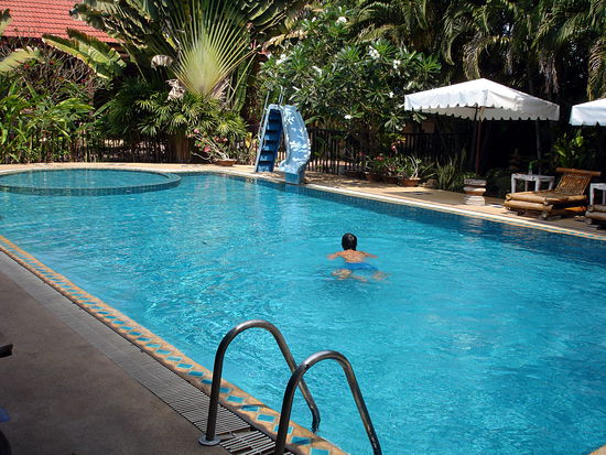Gegessen habe ich gestern im Hotel. So arg viel Auswahl hat man hier im Ort nicht. Außerdem habe ich schon angefangen, die Zeit zu nutzen. Mein Zimmer für 500 B (das teuerste Airconzimmer im Hotel) beinhaltet nämlich zwar kein Frühstück, dafür kostenloses Wi-Fi. Außerdem gibt es einen schönen Swimmingpool. Das waren auch die Argumente dafür, hier zwei Nächte zu bleiben. Der große Nachteil sind die Moskitoschwärme hier, die sich auch in den AC-Zimmern tummeln.