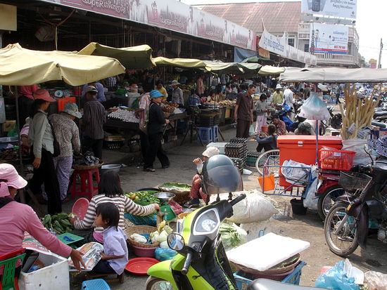 Nach einem überraschend guten Latte Macchiato im angebauten Minikaffee meines Hotels war ich um 10:10 "im Einzugbereich" des Busbahnhofs angekommen. So genau lässt sich das nicht sagen wo er anfängt und aufhört. Nachdem kein Taxi oder so greifbar war bin ich gelaufen und habe dabei auch den Markt gestreift wo ich wieder einmal für etwas Aufsehen sorgte. Dafür bin ich aber auch ziemlich schnell von zwei Typen angesprochen worden wo ich hin will. Der erste war nach "Battambang" weg, der zweite aber zeigte mir, dass ich gerade an einer "Bushaltestelle" vorbeigelaufen war. Dabei kann man sie eigentlich gar nicht übersehen - wenn man nicht gerade konzentrierte nach etwas anderem wie z.B. Busbahnsteige Ausschau hält.
