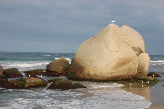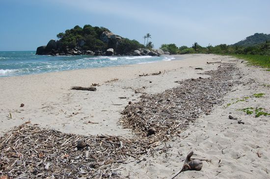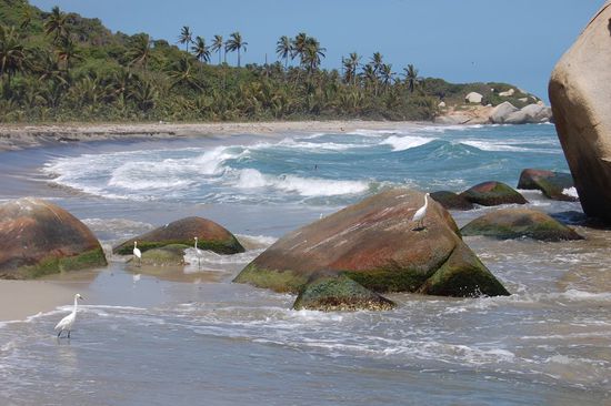 Was uns dann auch gleich mal wie ziemliche Touristenabzocke vorkam, war der Fakt, dass Ausländer, also Nicht-Kolumbianer gleich den doppelten Eintrittspreis in den Nationalpark zahlen müssen. Hinzu kommt, dass unser Lonely Planet aus dem Jahre 2003 besonders für Kolumbien preistechnisch nicht mehr auf dem aktuellsten Stand ist. Doch was tut man nicht alles für einen Traumstrand, und so zahlten wir und fügten uns auch noch der Polizeikontrolle, die uns nach Spirituosen und Marihuana fragten - wir hätten ihnen auch wirklich gerne geholfen, aber man hat uns gesagt, dass der Besitz in Kolumbien doch eher gefährlich sein soll Also rein in den nächsten Bus und diesmal wirklich günstig für 2.000 Pesos (ca. 75 Cent) pro Person eine viertel Stunde rein in den Dschungel. Auf der Fahrt lernten wir Elena kennen, eine Italienerin, die auf ungewisse Zeit allein die Amerikas bereist. Sie kam gerade von einem fünf-Tage Trip zur Ciudad Perdida (das größte Tayrona- Überbleibsel, der Name bedeutet "Verlorene Stadt") zurück, dementsprechent dreckig und fertig. Nach ihren Schilderungen von Gewaltmärschen im Dauerregen waren wir auch gar nicht mehr traurig drüber, diese Sehenswürdigkeit auszulassen. Nach dem Bus gings noch eine gute Stunde zu Fuß über einen Dschungelpfad hin zum Campingplatz, wo wir uns dann, körperlich ziemlich fertig, aber glücklich, angekommen zu sein, einmieteten. Das Zelt war perfekt mit dem Einbruch der Dunkelheit aufgebaut, wir gingen noch duschen (lernte dort Adam, einen Polen kennen) und begaben uns ins Restaurant, wo wir uns freuten, Elena wieder zu treffen. Trotz langsamer und unfreundlicher Kellnerinnen war es ein sehr feiner Abend noch mit ihr, Höhepunkt war sicher die Schlange, die sich ab der Hälfte der Zeit schräg über unseren Köpfen im offenen Dachstuhl dahinschlängelte. Das macht ein Abendessen erst so richtig zum spannenden Genuss Auf unsere Frage hin, sagten uns die Lokalen dort, dass dies keine aggressive Art wäre, was uns beruhigte. Allerdings verloren sie auch kein Wort über die Giftigkeit, was uns dann doch wieder beunruhigte. Leider hatten wir unsere Kamera gerade nicht zur Hand, darum müssen wir von dieser Situation leider auf Photos verzichten. Wir verabschiedeten uns dann von Elena und gingen mit Taschenlampe bewaffnet in Richtung unseres Zeltes...