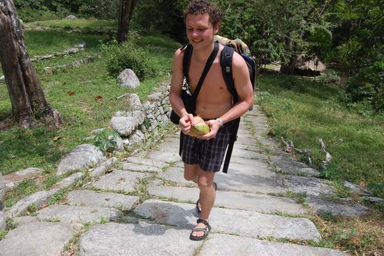 Am Sonntag sind wir zu einem Ausflug aufgebrochen, der uns zuerst eine weitere dreiviertel Stunde zum zweiten Campingplatz und von dort aus weitere knappe zwei Stunden über dutzende Steinstufen den Jahrhunderte alten Dschungelpfad der Tayrona Indianer zu einem ihrer Dörfer führte.