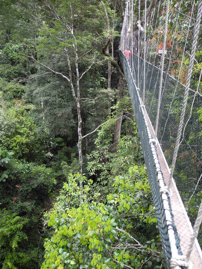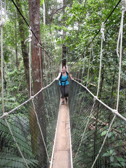 Als wir gestern ankamen, hatte es wie die Tage zuvor geregnet und uns wurde gesagt, dass die Wanderwege und die berühmten Hängebrücken deshalb gesperrt wären. Also hieß es hoffen, dass es innerhalb der nächsten zwei Tage trocken werden würde. Und wir hatten mal wieder Glück: heute schöner Sonnenschein bis wir wieder im Hotel waren. Also heute morgen früh raus und ab in den Regenwald. Die Wege sind hier wunderschön und bei mir herrschte große Vorfreude auf die Hangebrücken (Canopy Walkway) zwischen den Bäumen. Diese sind die längsten der Welt und bis zu 50 Meter hoch! Und es war der absolute Hammer! Was für ein Kick über diese wackeligen Brückchen zu laufen, hoch oben in den Baumkronen. Nach einer halben Stunde hatten wir die 500 Meter bewältigt und waren doch froh wieder festen Boden unter den Füßen zu haben. Da es meinem Knie besser geht (YIPPIE YIPPIE YEAH) und ich mein Glück nicht zu sehr heraus fordern wollte, bin ich danach wieder Richtung Heimat gelaufen. Caro hat noch einen Berg bestiegen und kam zwei Stunden fix und fertig, aber happy wieder. Die Sportskanone