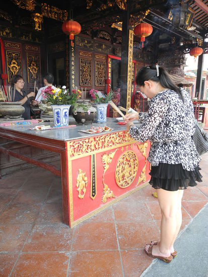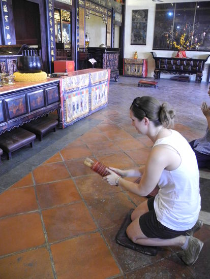 In einem chinesischen Tempel hatten wir Leute dabei beobachtet, wie sie eine Schachtel mit vielen Stäbchen so lange geschüttelt haben, bis eines der Stäbchen heraus gefallen ist. Wir hatten uns gefragt, was dies wohl genau bedeuten würde. Kurz danach knieten wir ebenfalls vor dem Altar und taten das gleiche. Man erzählte uns, dass man an ein Problem oder ähnliches denken sollte. Dann rüttelt man so lange bis ein Stäbchen raus fällt. Darauf steht wiederum eine Nummer für eine Geschichte und diese kann man in einem Buch nach lesen. Eine Frau hatte uns sehr nett geholfen. Sie fragte mich, ob ich verheiratet wäre. Wenn nicht, sollte ich mich damit sehr beeilen, sonst würde meine Geschichte nicht gut ausgehen Hilfe!