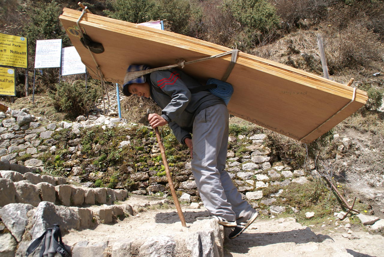 Die Träger im Khumbu haben ein T-förmiges Holz dabei, beim laufen benutzen sie es als Stock, wenn sie stehenbleiben stellen sie es unter den Korb und können sich so ausruhen!! Genial!!