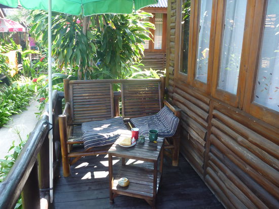 Auf der kleinen Veranda davor gab es Fruehstueck. Frischer knuspriger Toast und Tee.