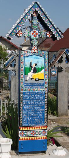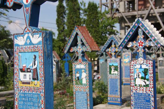 Die zwei Stunden vergehen wie im Flug und schon sind wir am fröhlichen Friedhof angekommen, den wir dann uns auch gleich gemeinsam angucken. Rund um die Kirche stehen rund 700 Holzkreuze, die alle in einem leuchtenden Blau gestrichen sind. Jedes geschnitzte Kreuz zeigt eine Szene aus dem Leben des Verstorbenen dargestellt, Frauen meist mit Spinnrad oder am Herd und die Männer beispielsweise mit einer Sense auf dem Feld, mit ihren Tieren oder aber auch mal in der Kneipe. Manchmal aber auch wurde die Ursache des Todes dargestellt und so gibt es einige Kreuze mit Autounfällen oder aber auch Zügen. Darunter steht dann ein Spruch über das Leben des Verstorben, wobei hier wohl nicht jeder nur gut wegkommt. Leider natürlich auf Landessprache, so dass wir nicht viel verstehen. Da es der Friedhof aber inzwischen auch in die Rumänien-Reiseführer geschafft hat und somit wir nicht die Einzigen hier sind, findet sich schnell ein Dolmetscher der seiner Gruppe gerade einige Inschriften übersetzt.