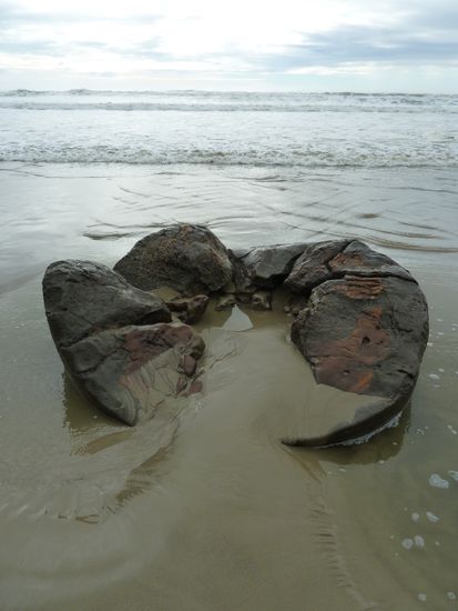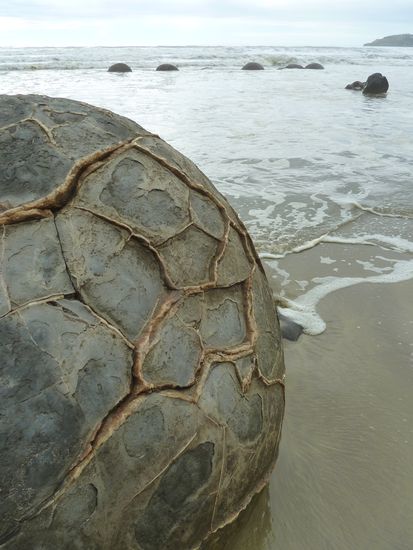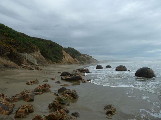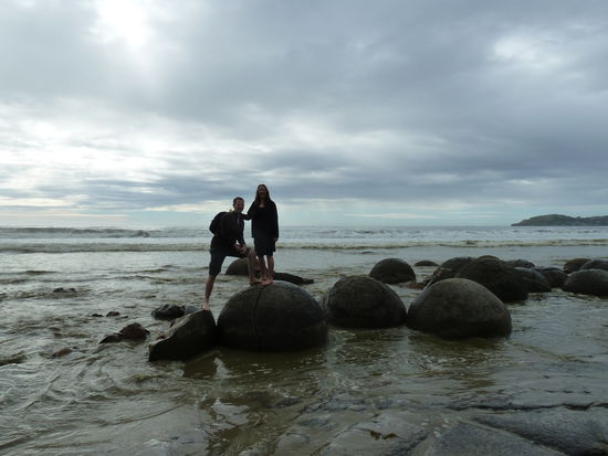 Nachdem wir in der Naehe von Moeraki auf einem Campingplatz mit heisser Dusche uebernachtet hatten, wollten wir uns am Morgen darauf die Sensation dieses Ortes ansehen: die Moeraki Boulders. Diese, ich nenne sie mal, Gesteinskugeln, sind nur bei Ebbe zu sehen. Wir hatten natuerlich wieder mal verpennt, aber trotzdem waren wir noch rechtzeitig da, bevor sie wieder ganz vom Meer bedeckt waren. Also weg mit die Schuh und rein ins Vergnuegen!!!
